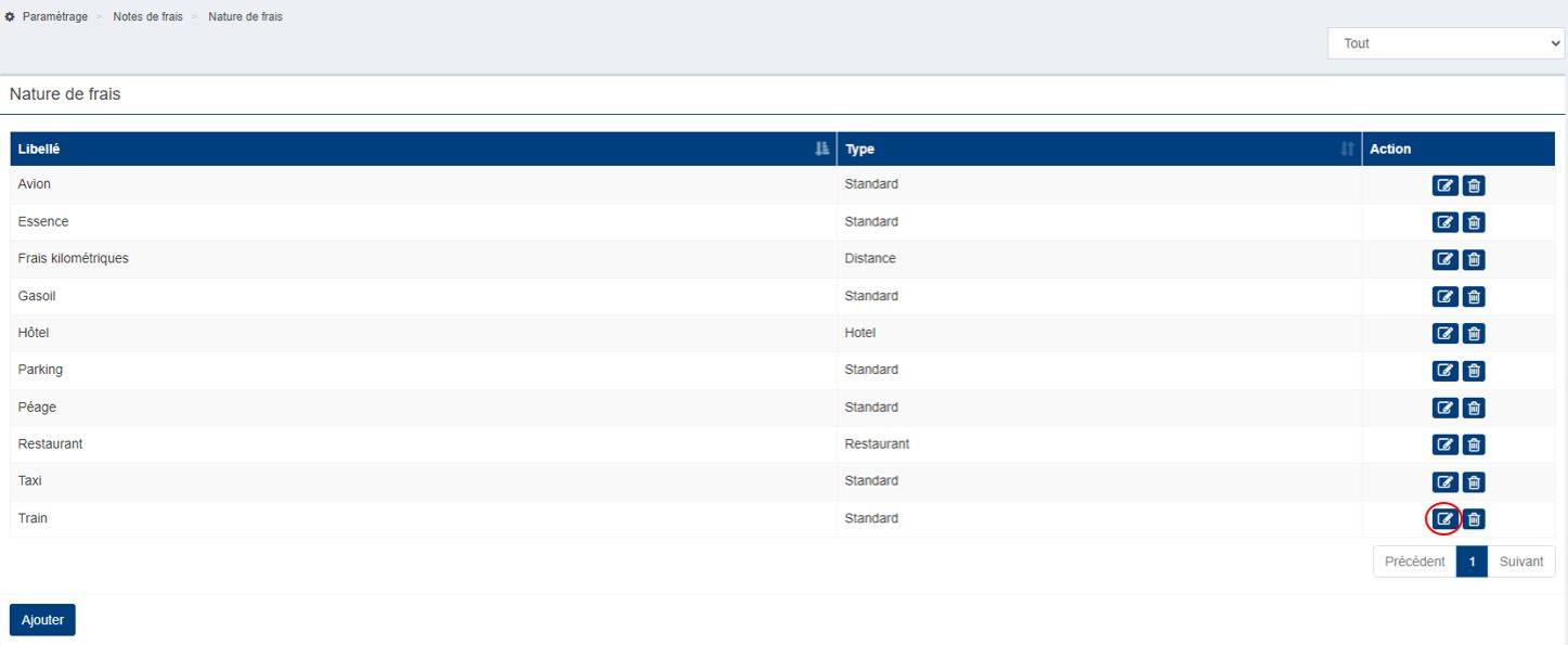 2. Choisissez la nature de frais concernée en cliquant sur le premier bouton sous “Action” vous permettant d'effectuer des modifications.